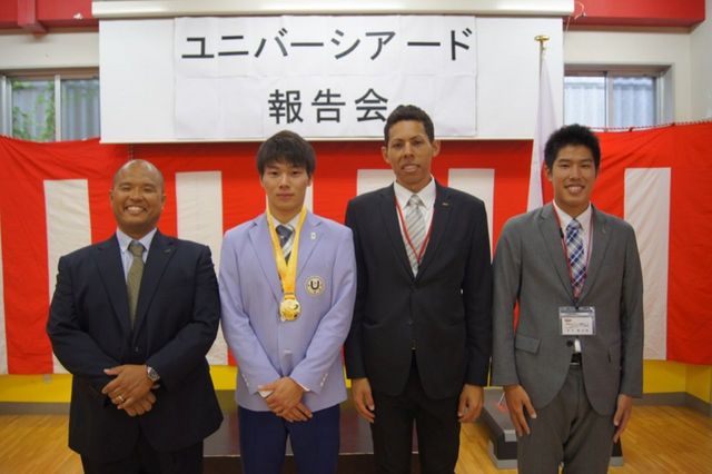 平成29年9月4日(月)、先日行われた「第29回ユニバーシアード競技大会」陸上競技4×100mリレーにおいて金メダルを獲得した、本学2年生の田中佑典君の報告会が行われました。