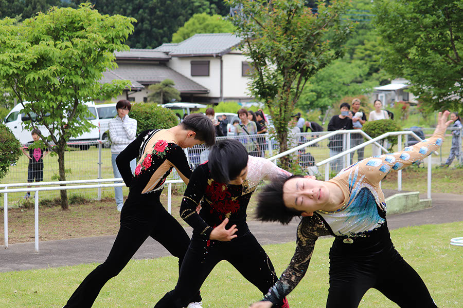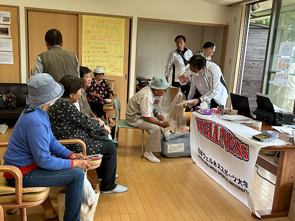 大学新体操部は、身体計測の測定を担当し実年齢と測定結果の年齢を伝える様子はとても楽しそうでした。ご高齢の方は、若い若いと喜んでいました。計測後、新体操の演技を披露し、初めて見た迫力ある演技に皆さんから大きな拍手をいただきました。